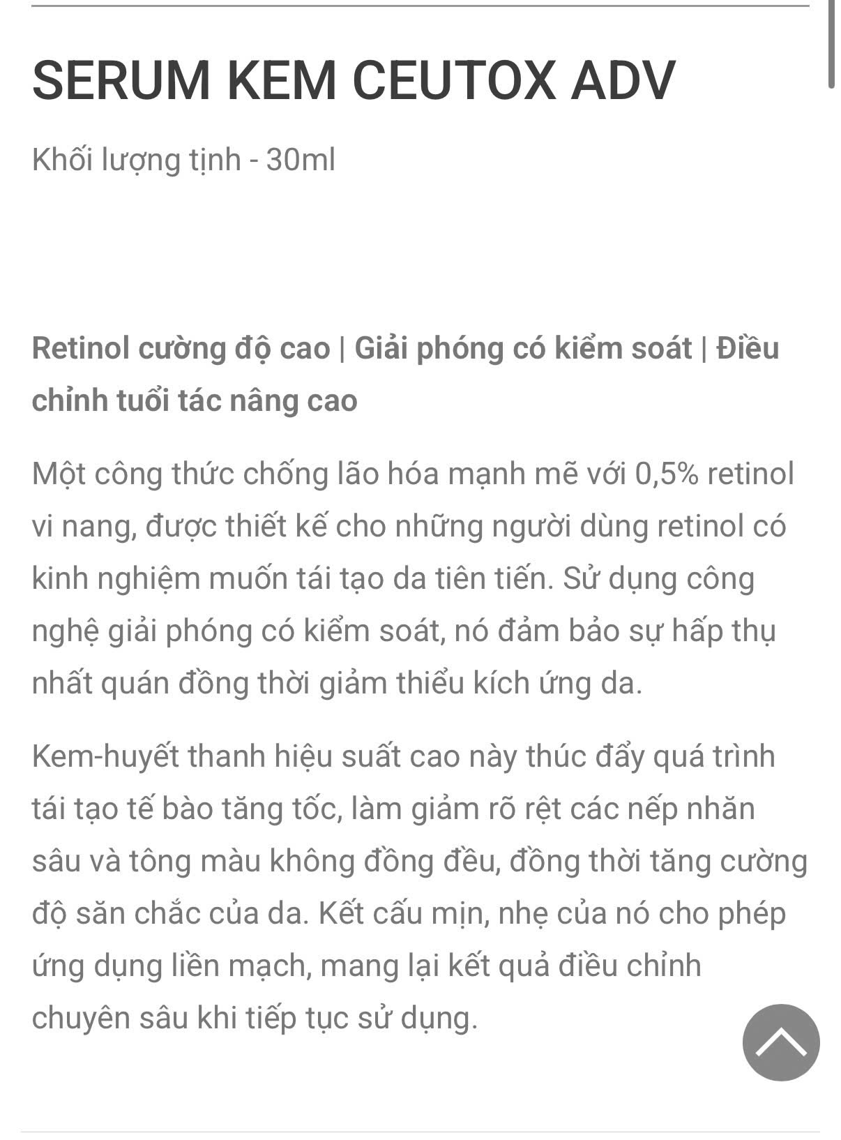 Một công thức chống lão hóa mạnh mẽ với 0,5% Retinol vi nang, được thiết kế cho những người dùng retinol có kinh nghiệm muốn tái tạo da tiên tiến. Sử dụng công nghệ giải phóng có kiểm soát, đảm bảo sự hấp thụ nhất quán đồng thời giảm thiểu kích ứng da.